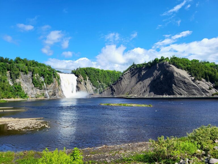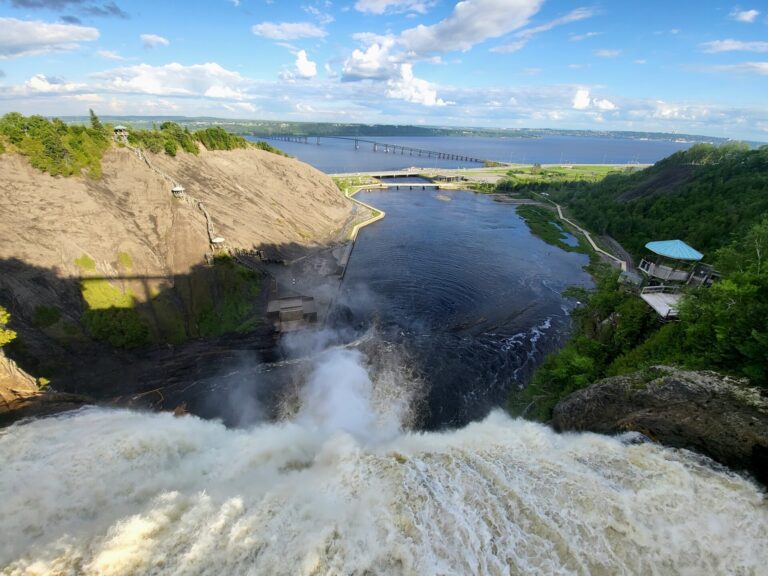 Kurz vor der Stadt Québec erreichen wir die Montmorency Falls, einen der beeindruckendsten Wasserfälle, die wir auf unserer bisherigen Reise gesehen haben. Unser Rundgang beginnt im weitläufigen Park, der uns direkt zur Hängebrücke führt. Von dort oben gewinnen wir einen schwindelerregenden Eindruck davon, mit wie viel Wucht die gewaltigen Wassermassen 83 Meter tief in den Sankt-Lorenz-Strom stürzen. Das Donnern des Wassers unter unseren Füssen ist beinahe spürbar.