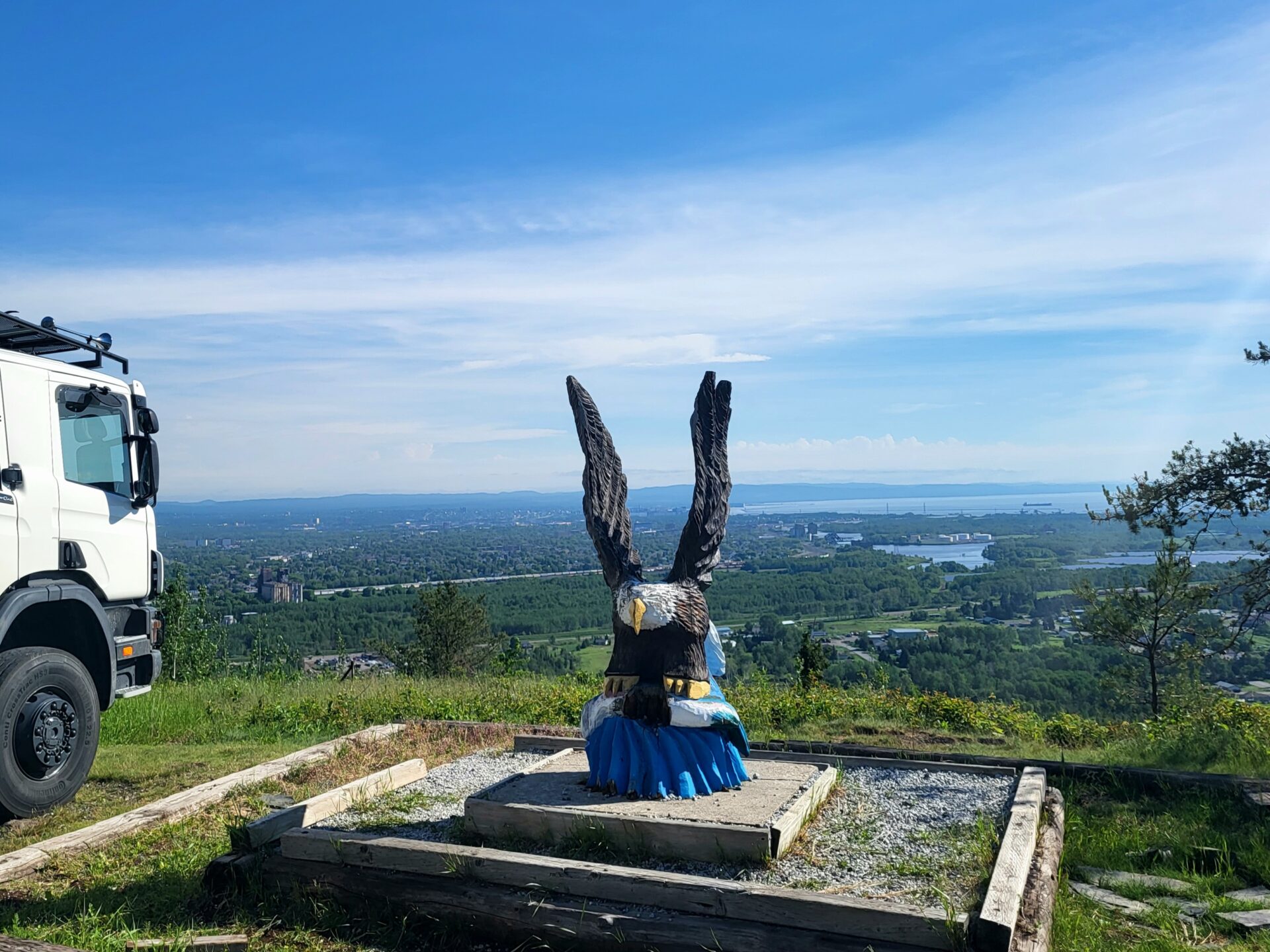 In Thunder Bay zieht es uns zum Mount McKay Lookout. Dort kommen wir mit einer Frau der First Nation ins Gespräch und erfahren, dass dieser Berg – von ihrem Stamm Animikii-wajiw („Donnerberg“) genannt – ein heiliger Ort ist. Auf ihren Rat hin entscheiden wir uns, den Weg bis zum obersten Plateau zu wandern.
