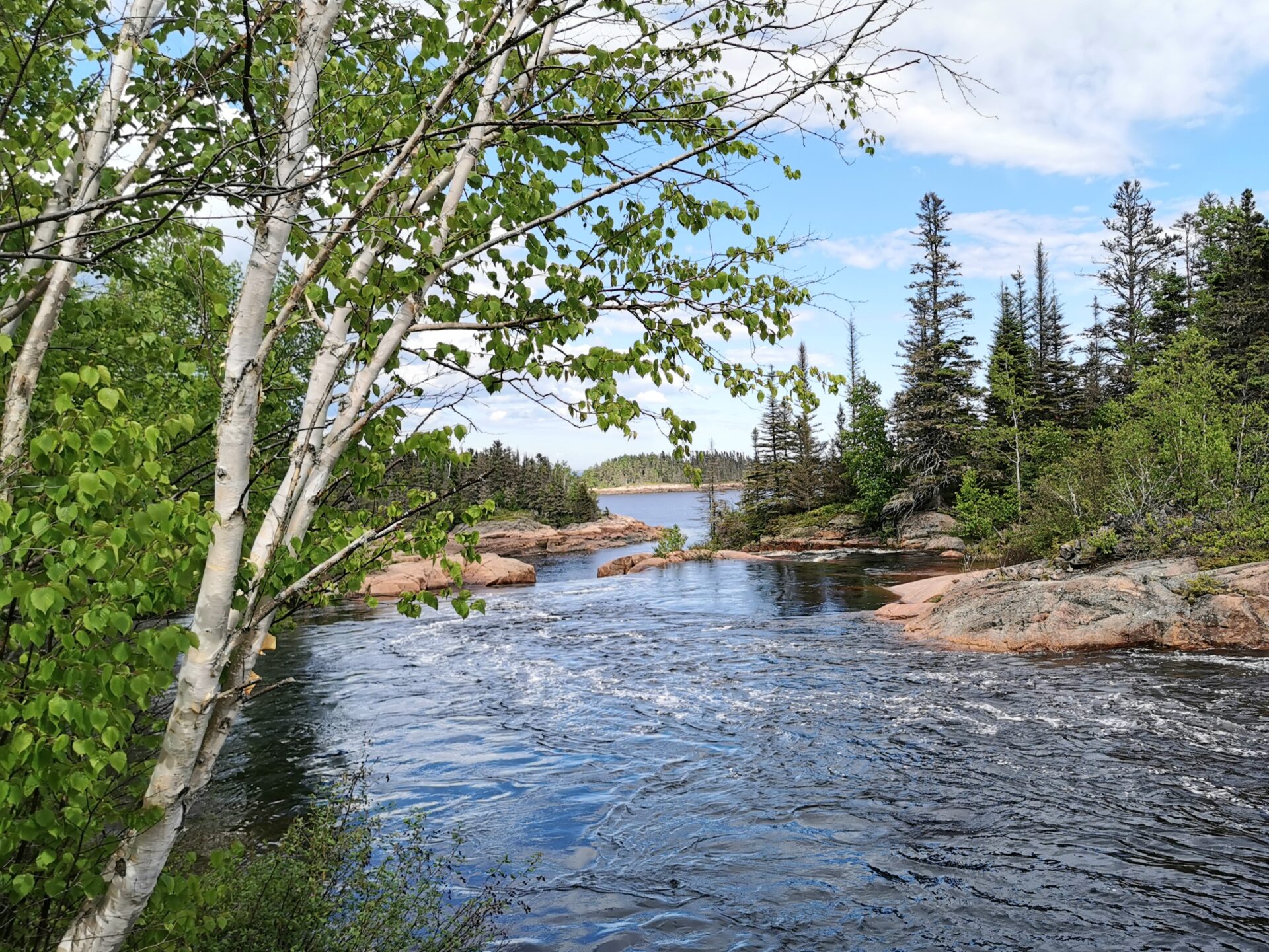 Manchmal findet man per Zufall wunderschöne Orte dort, wo man gar nicht damit rechnet. Auf dem Parkplatz eines ehemaligen Campingplatzes legen wir eine Pause ein, um frische Luft zu schnappen und uns die Beine zu vertreten. Was als kurzer Halt geplant war, entwickelt sich zu einer tollen Entdeckung: Wir spazieren ein Stück am Rivière Papinachois entlang und gelangen nach kurzer Zeit zu einem herrlich rauschenden Wasserfall.