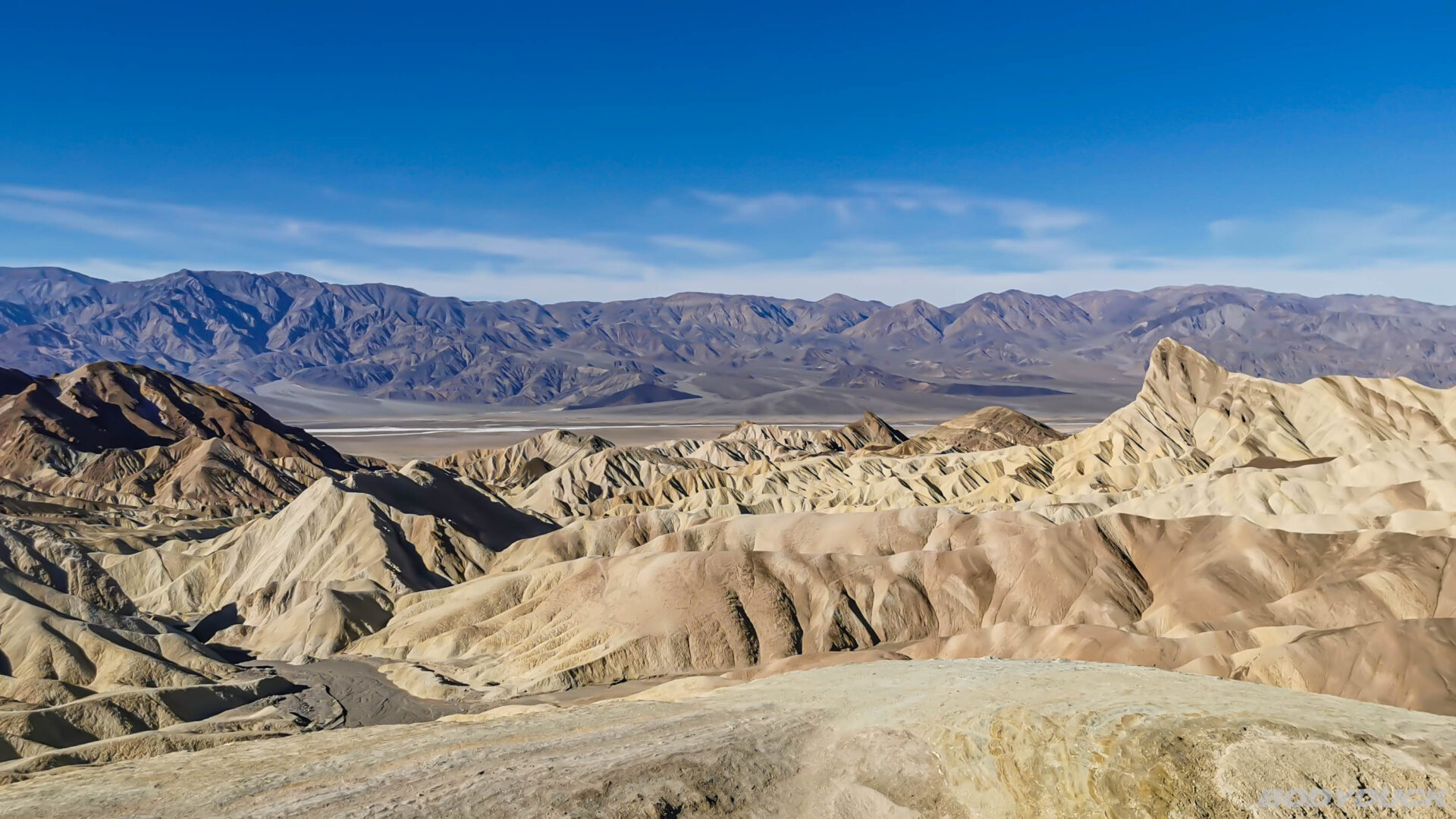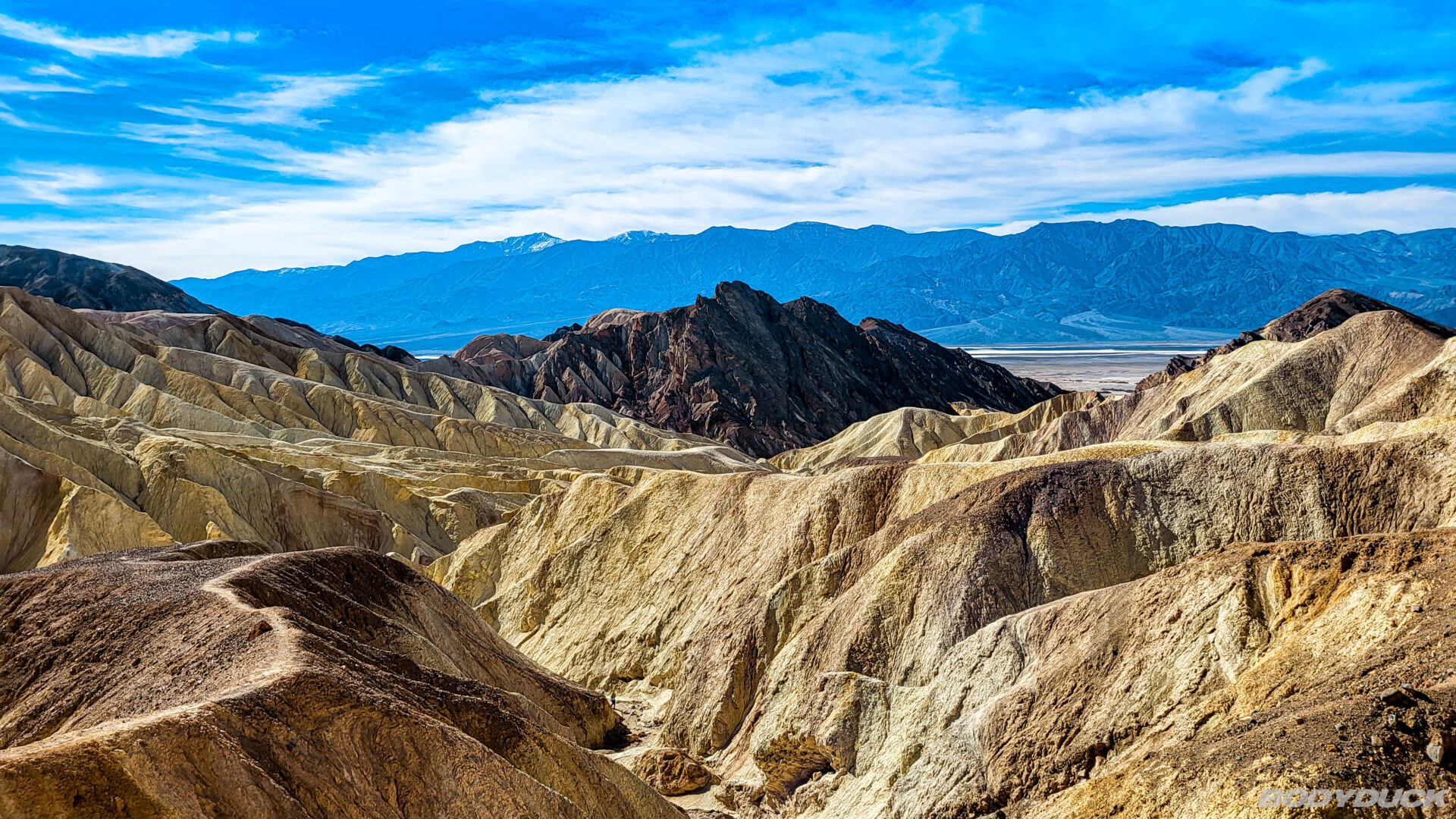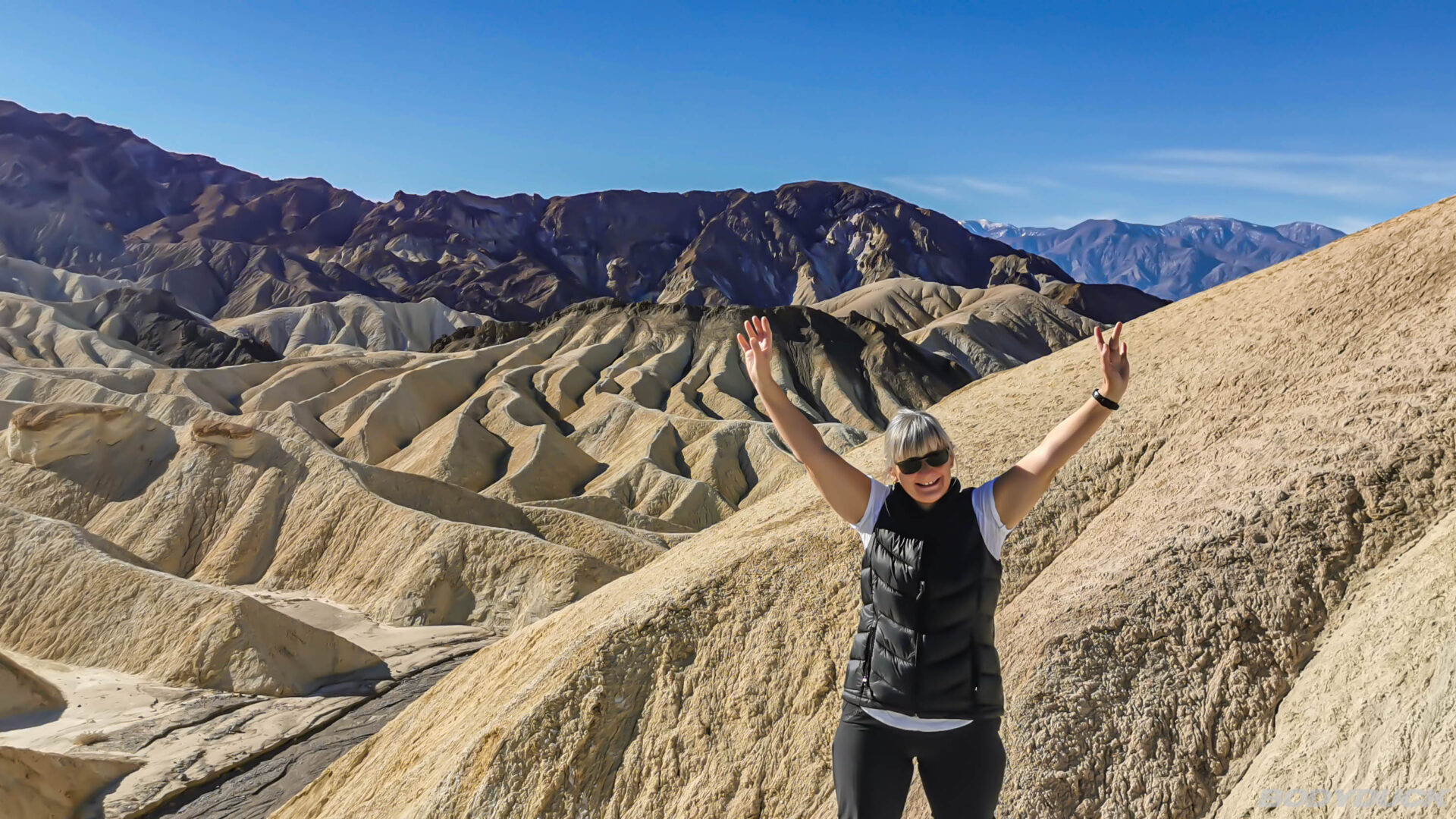 Ein schöner Aussichtspunkt mit phänomenalem Rundblick erwartet uns am Zabriskie Point. Die Landschaft wirkt hier wie aus einer anderen Welt: Die Erosion hat bizarre, gelb-braune Wellen und Zacken in den Boden geformt, die im Sonnenlicht golden leuchten. Man kann verschiedene Trails laufen, um tiefer in diese Badlands einzutauchen, oder einfach nur auf den Hügeln herumklettern, um die beste Perspektive für ein Foto zu finden. Von hier oben überblicken wir die Weite des Parks und spüren die monumentale Kraft der Natur.