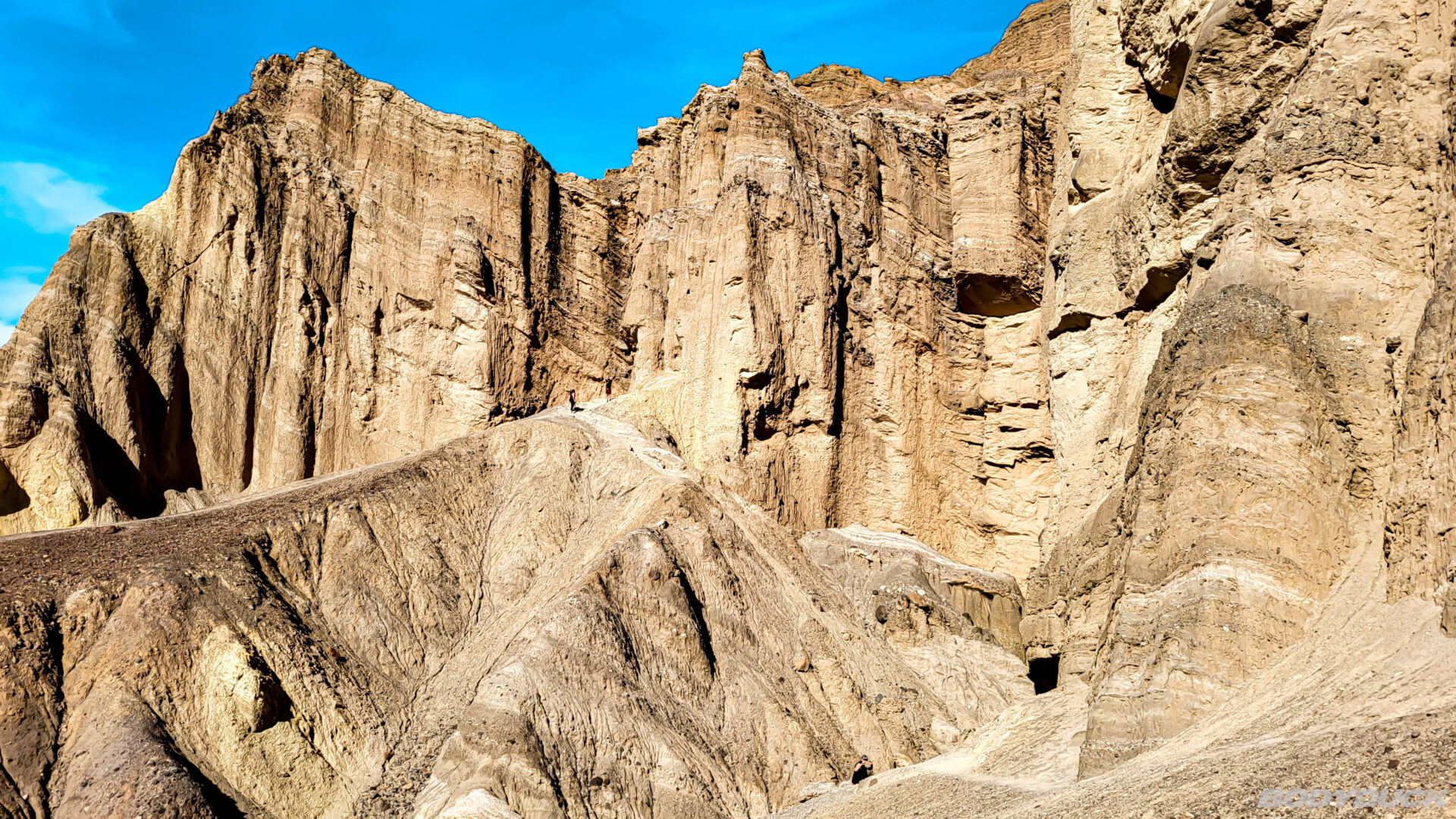 Vom Parkplatz des Golden Canyon aus wandern wir zur beeindruckenden Red Cathedral. Die Strecke führt uns an einer Verzweigung vorbei, über die man alternativ zum Zabriskie Point gelangen könnte. Wir laufen etwa eine halbe Stunde lang durch ein trockenes Flussbett, das tief zwischen steilen Felswänden und gelbem Sandstein eingebettet ist. Es ist kaum vorstellbar, dass während der Regenzeit hier enorme Wassermassen hindurchschiessen, denn im Moment wirkt die Landschaft so trocken, als hätte es hier nie geregnet.