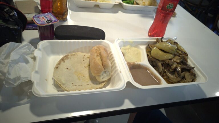 Kaum auf See, beginnt in der Kantine die Essensausgabe. Da eine Mahlzeit im Fahrpreis inbegriffen ist, stürmen alle gleichzeitig die Theke – man möchte ja nichts verpassen. Zur Auswahl stehen drei Gerichte: