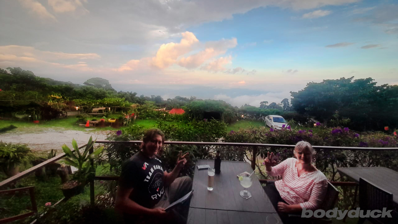 Im Rancho Tadajas RV Park haben wir ein Plätzchen gefunden, an dem wir uns sofort wohlfühlen. Die grosse Anlage wird von Oskar, dem Platzwart, mit unglaublich viel Herz und Blut gepflegt – das merkt man an jeder Ecke. Von der Terrasse aus geniessen wir eine fantastische Aussicht über die Landschaft und auf den Vulkan Santa Ana. Auch wenn das Wetter momentan mehrheitlich bedeckt ist und es häufig regnet, hat die neblige Stimmung über dem See und den Bergen ihren ganz eigenen Reiz.