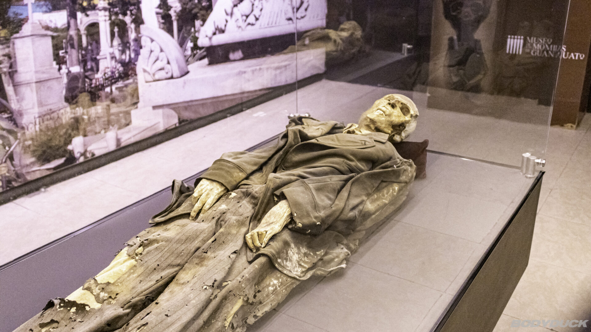 Ausgestellt sind 57 Überreste von ehemaligen Bewohnern der Gemeinde Guanajuato, die zwischen 1870 und 1984 exhumiert wurden. Dass diese Körper nicht verwesten, liegt an den speziellen Bodenbedingungen und dem extrem trockenen Klima der Region.