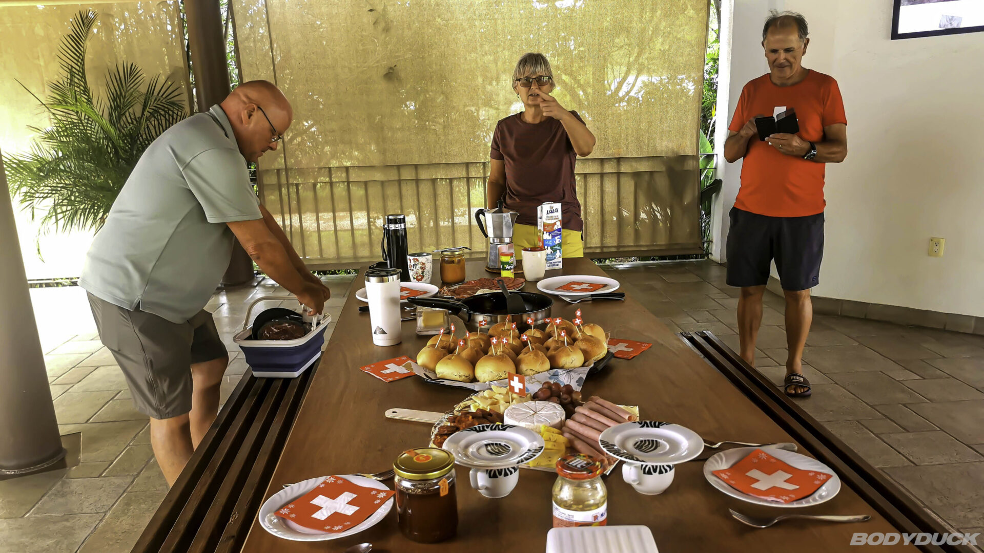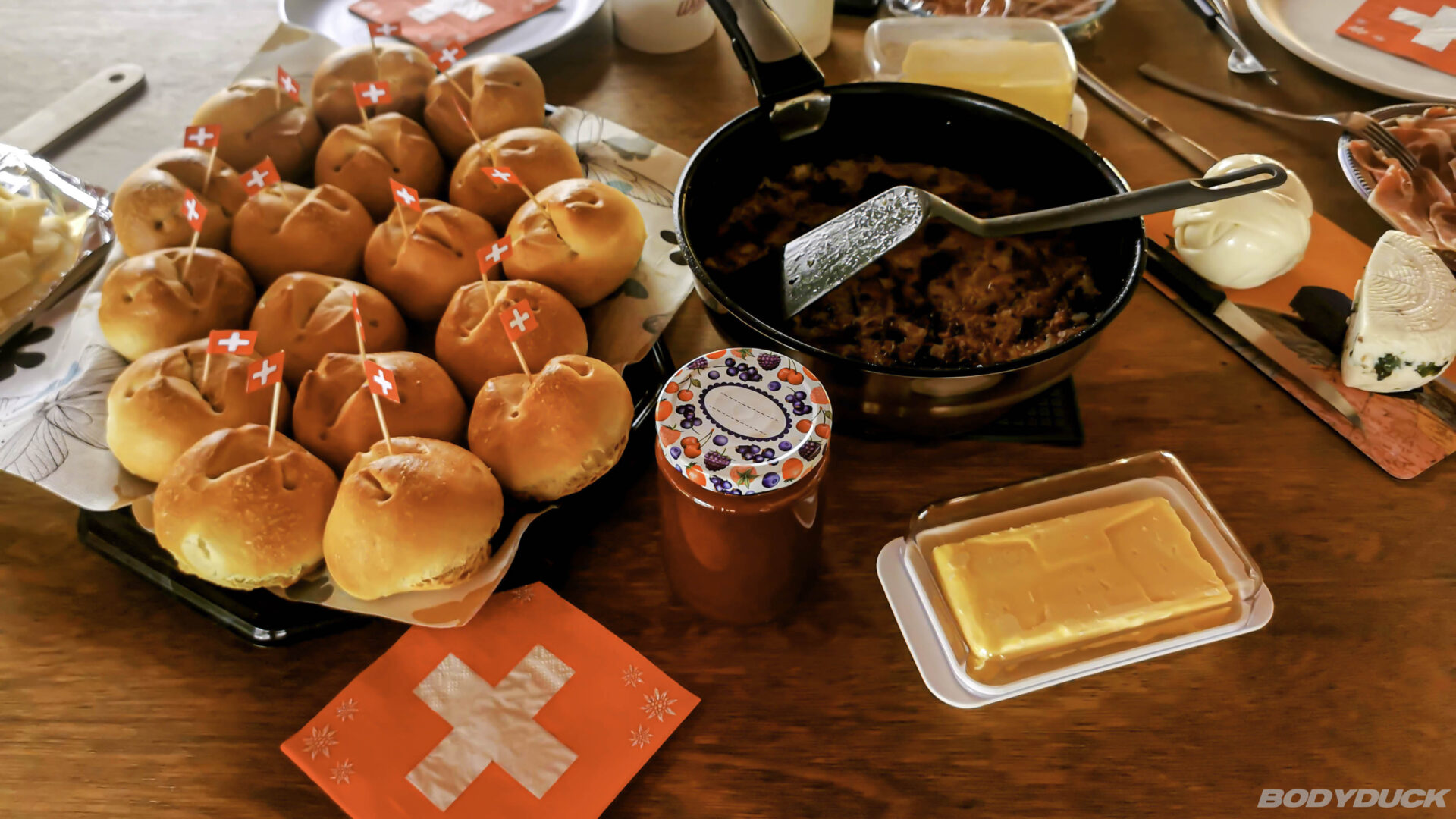 Heute ist der 1. August, der Nationalfeiertag der Schweiz. Wir feiern diesen besonderen Tag mit einem echt schweizerischen Brunch in bester Gesellschaft. Das Herzstück des Tisches ist der 1. August-Weggen, den Zsolt natürlich höchstpersönlich selber gebacken hat. Unsere Gäste haben viele weitere Köstlichkeiten beigesteuert, sodass wir bei bester Stimmung und echtem Heimatgefühl zusammensitzen.