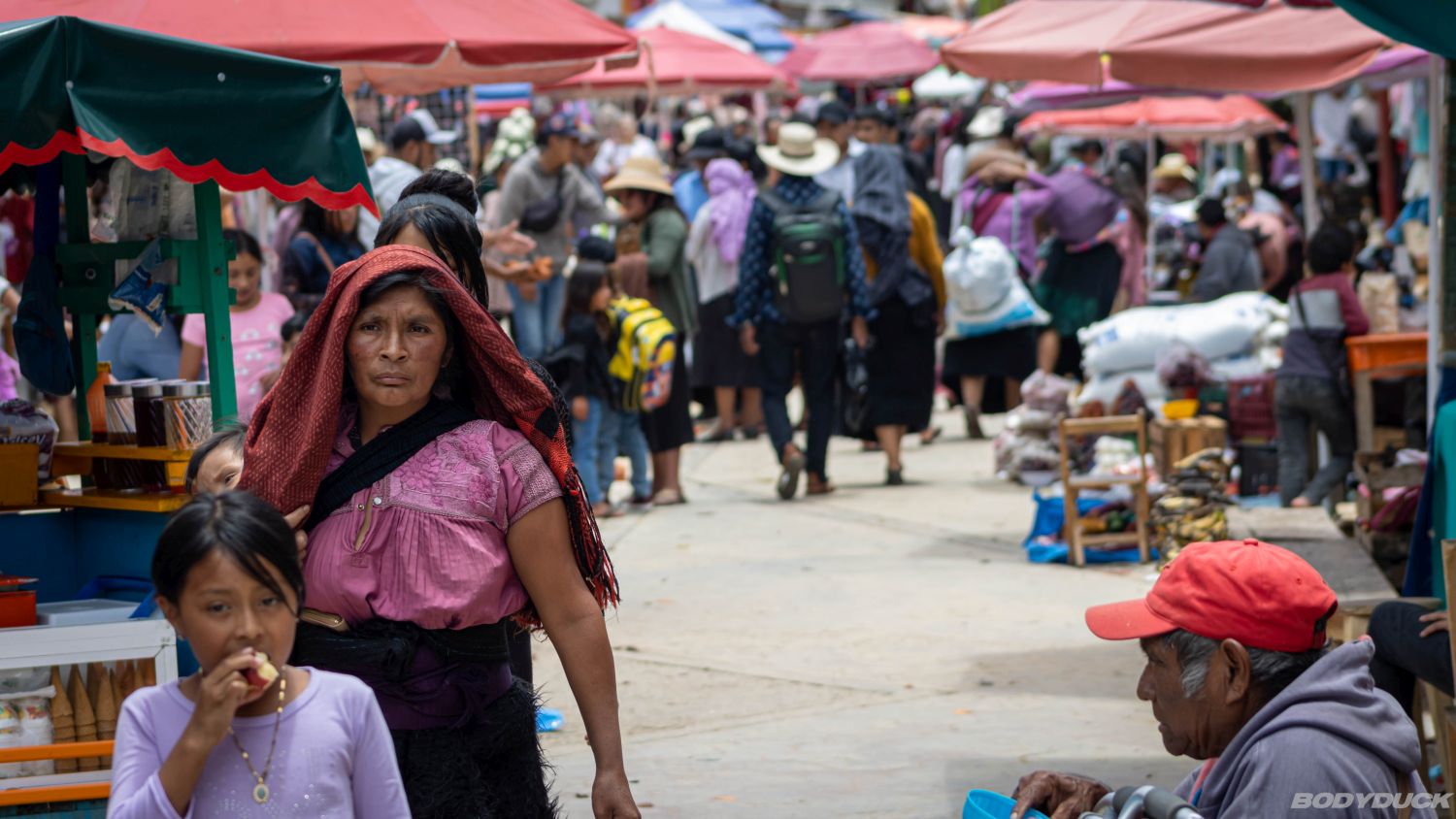 Zuerst betreten wir die Kirche – ein Ort der absoluten Mystik. Zwischen den Kiefernadeln auf dem Boden und den tausenden Kerzen scheint die Zeit stillzustehen. Fragenstellen und Fotografieren sind streng verboten, was die Konzentration auf das Wesentliche schärft. Doch kaum tritt man wieder hinaus ins Freie, wird man von der Energie des Marktes empfangen. Überall bieten Einheimische ihre Waren an, es wird gefeilscht und gelacht. Der Kontrast könnte nicht grösser sein: Drinnen die meditative Verbindung zu den Ahnen und Heiligen, draussen das geschäftige Treiben des Alltags. Die Frauen in ihren markanten schwarzen Wollröcken prägen das Bild. Es ist faszinierend zu sehen, wie diese Gemeinschaft ihre Traditionen sowohl im Gebet als auch im Handel mit Stolz und Selbstverständlichkeit pflegt. Ein Tag, der uns eine völlig andere Kultur hautnah spüren liess.