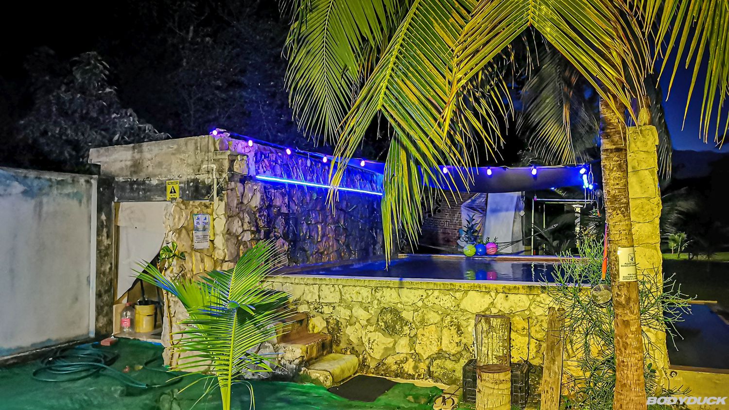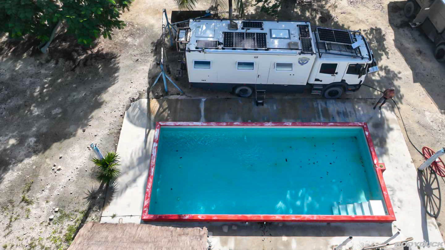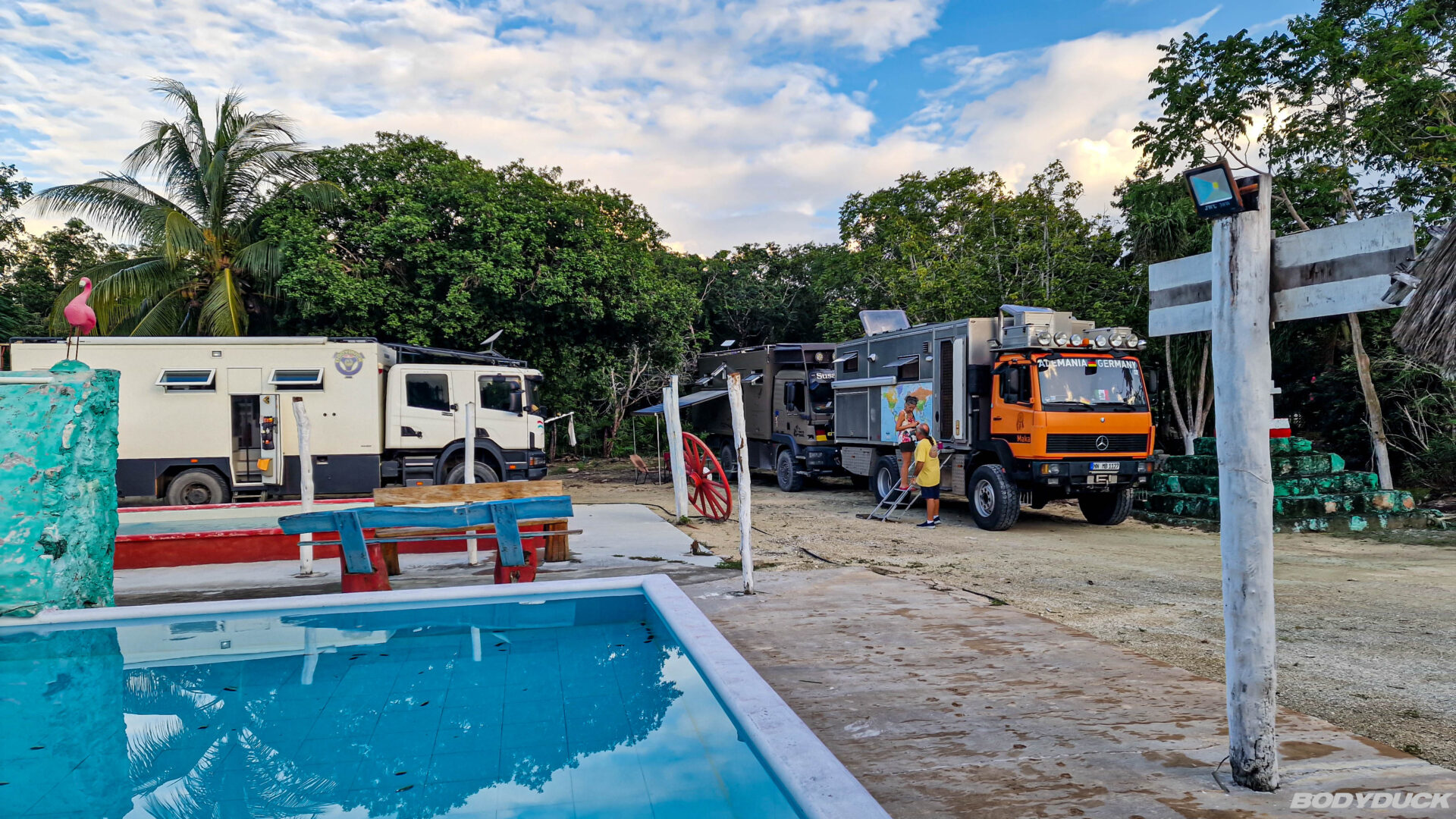 Per Zufall entdecken wir an der Hauptstrasse Richtung Puerto Morelos die Rancho El Cardenal. Ein riesiges Areal mit zwei grossen Pools! Nach kurzer Nachfrage die Erleichterung: Für 500 Pesos pro Nacht dürfen wir hier bleiben. Es wird sogar noch geselliger, als Susanne und Klaus zu uns stossen. Gemeinsam verbringen wir einen tollen Abend am Pool und geniessen die neue, deutlich bessere Umgebung.