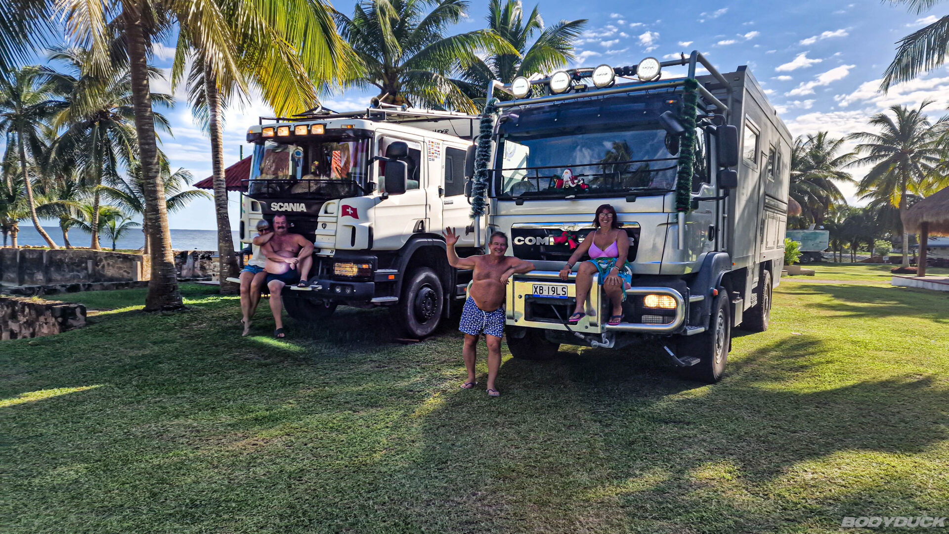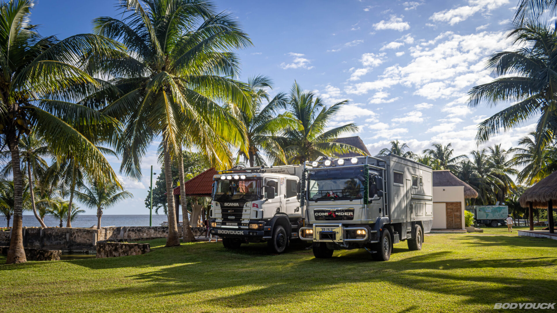 Wir steuern das Xax-Ha Resort an und erreichen den Platz am späten Nachmittag. Auch hier hat der massive Regen der letzten Tage tiefe Spuren hinterlassen; beim Befahren des aufgeweichten Rasens ziehen wir mit dem Bodyduck tiefe Furchen. Doch die Stimmung auf dem Platz ist grossartig! Wir treffen nicht nur Brigitte und Manfred wieder, sondern auch Andrea und Dirk, die wir noch aus Oaxaca kennen, sowie Anna und Angelo von @AaonVan.