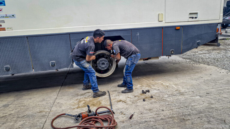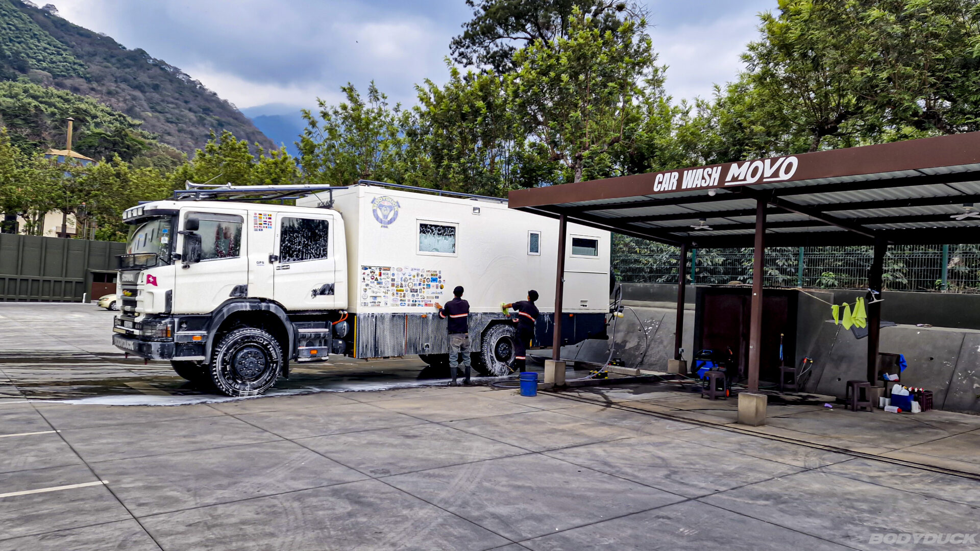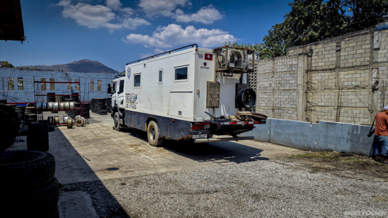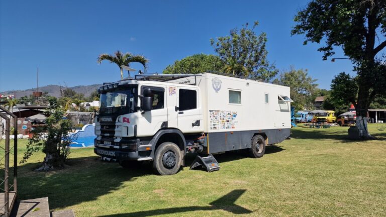 Nachdem die Hinterachse bereits frisches Gummi erhalten hat, ziehen wir nun konsequent nach: Auch die Vorderreifen werden erneuert. Die alten Continental haben nach knapp 100’000 km zwar noch Profil, aber die Belastung durch hunderte Kilometer Schotterpisten hat Spuren hinterlassen. Da unsere bevorzugten Conti-Reifen in ganz Guatemala nicht lagernd (und für den lokalen Markt kaum bezahlbar) sind, steigen wir auf LANDRY-Reifen aus chinesischer Produktion um. Der unschlagbare Vorteil: Sie sind rund, passen auf die Felgen und sind sofort verfügbar. Zum Abschluss gibt es für Bodyduck noch eine gründliche Handwäsche, damit das System sauber in die nächste Etappe startet.
