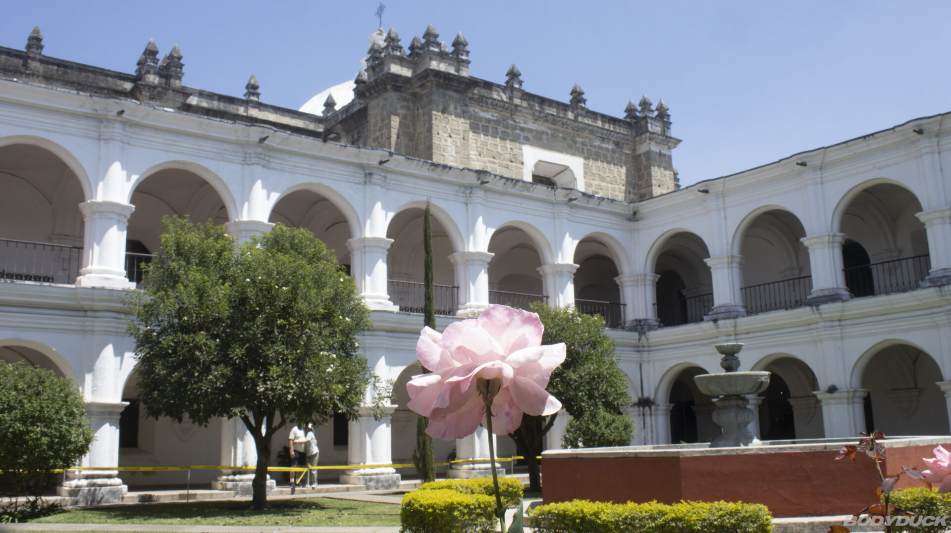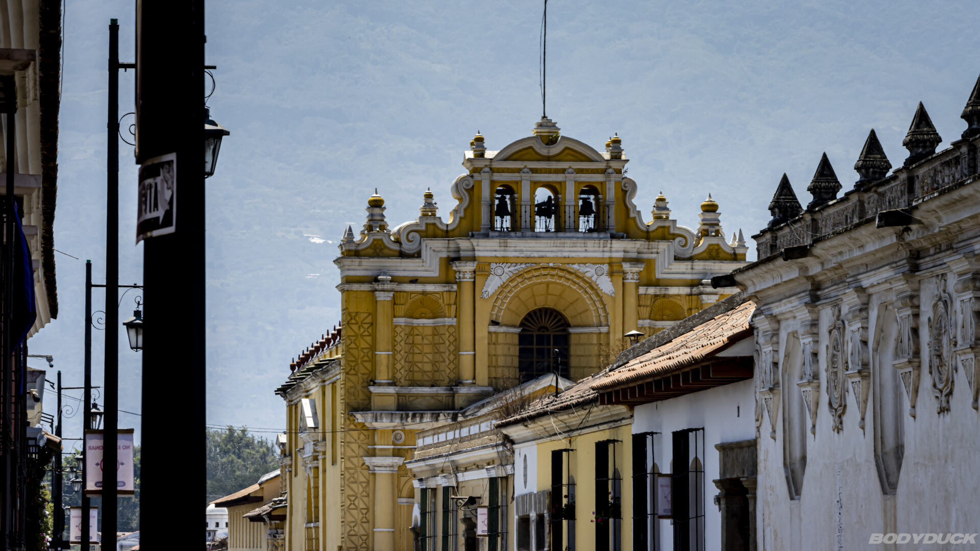 Der Aussichtspunkt bietet nicht nur einen Blick auf die Dächer und Ruinen, sondern macht auch die Dimensionen der Umgebung greifbar. Während man unten in den Gassen oft die Orientierung im Detail verliert, ordnen sich von hier oben alle Variablen: Die Kirchen, die Plätze und die umliegenden Berge fügen sich zu einem stimmigen Gesamtbild zusammen. Der Vulkan Agua wirkt von hier aus fast greifbar nah und unterstreicht die exponierte Lage der Stadt.