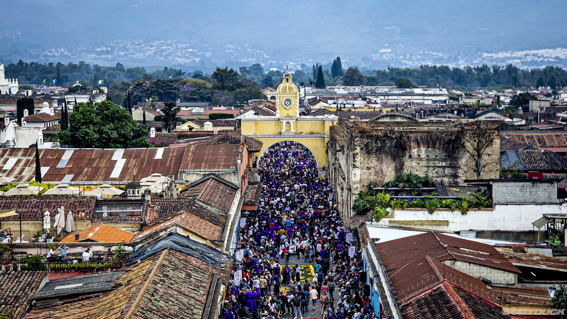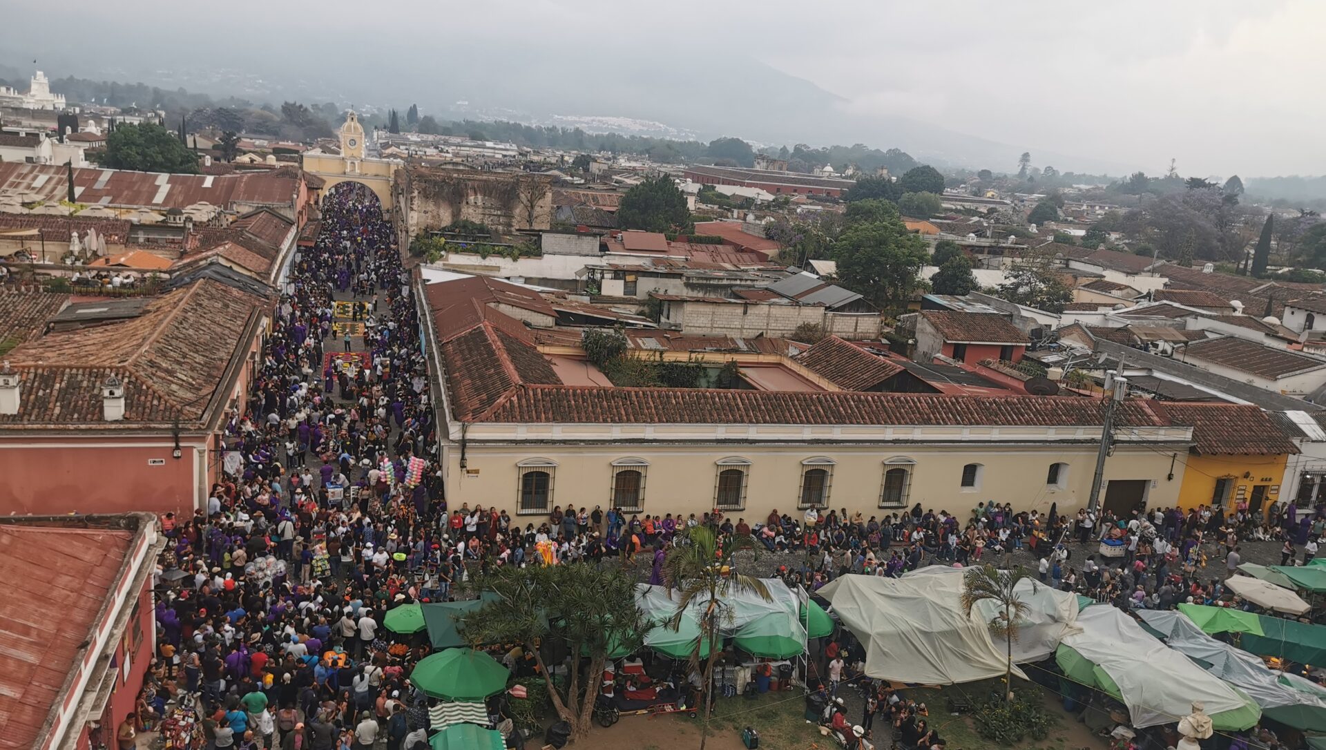 An unserem letzten Tag in Antigua gönnen wir uns einen ganz speziellen Blickwinkel auf das spirituelle Geschehen. Wir verfolgen eine weitere Prozession von der Dachterrasse der Iglesia de La Merced aus. Von hier oben bietet sich eine perfekte Übersicht über die Menschenmassen, die kunstvollen Alfombras und den rhythmischen Fluss der Prozession. Es ist ein majestätischer Abschluss für unsere Zeit in dieser Stadt, bevor wir morgen die Anker lichten.