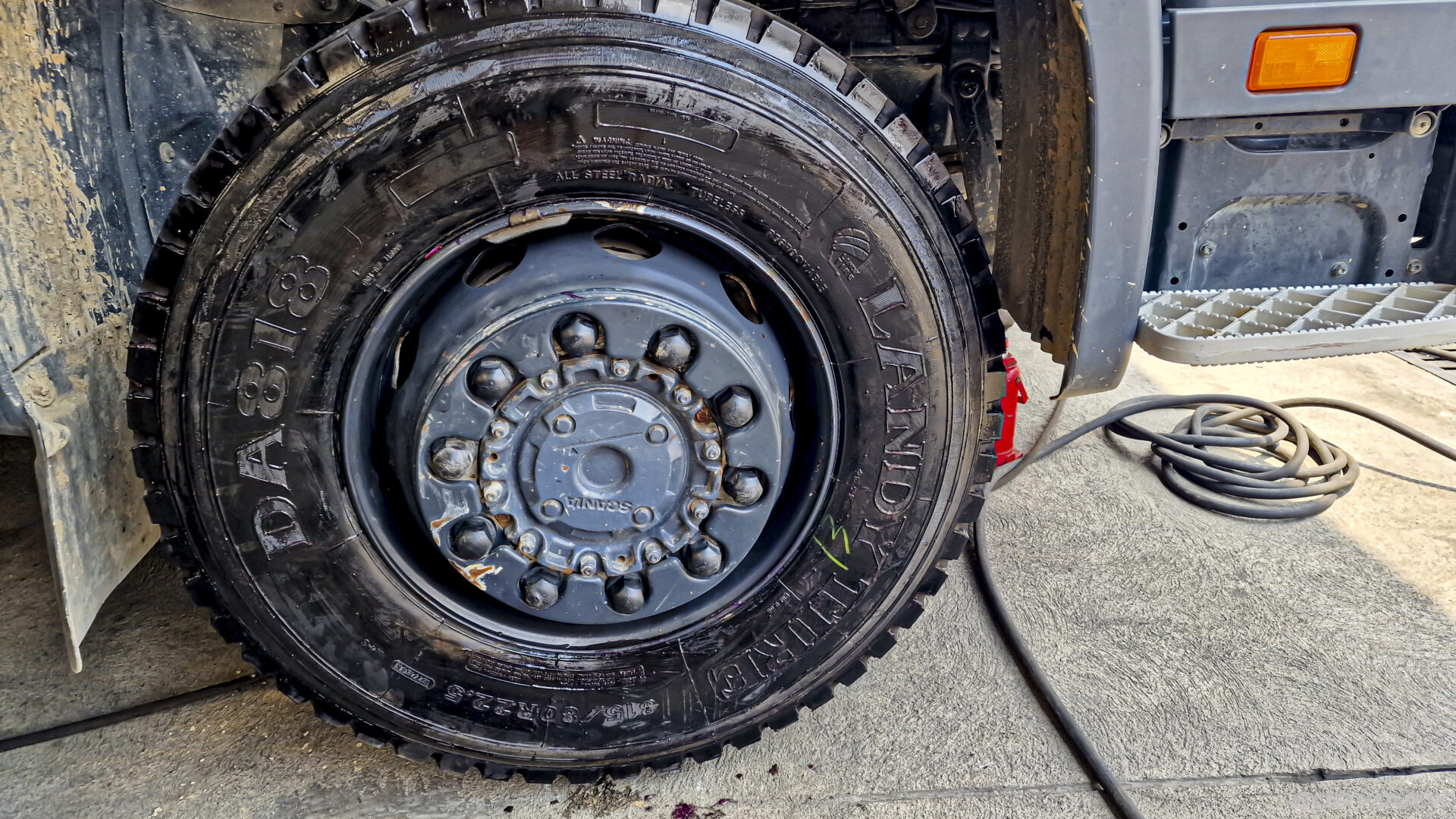 Da ein gebrauchter Reifen in meiner Grösse nicht aufzutreiben ist, fackeln wir nicht lange und investieren in die Sicherheit: Vier neue Reifen müssen her. Die bisherigen CONTINENTAL CROSSTRACK 315/80R22.5 HS3 haben hervorragende Dienste geleistet. Mit einer Laufleistung von fast 100’000 km bin ich mehr als zufrieden. Die zwei verbleibenden Reifen, die den Holzklotz-Angriff überlebt haben, nehme ich mit ruhigem Gewissen als Reserve mit – so fahren wir ab jetzt wieder mit einem stabilen Backup-System spazieren.