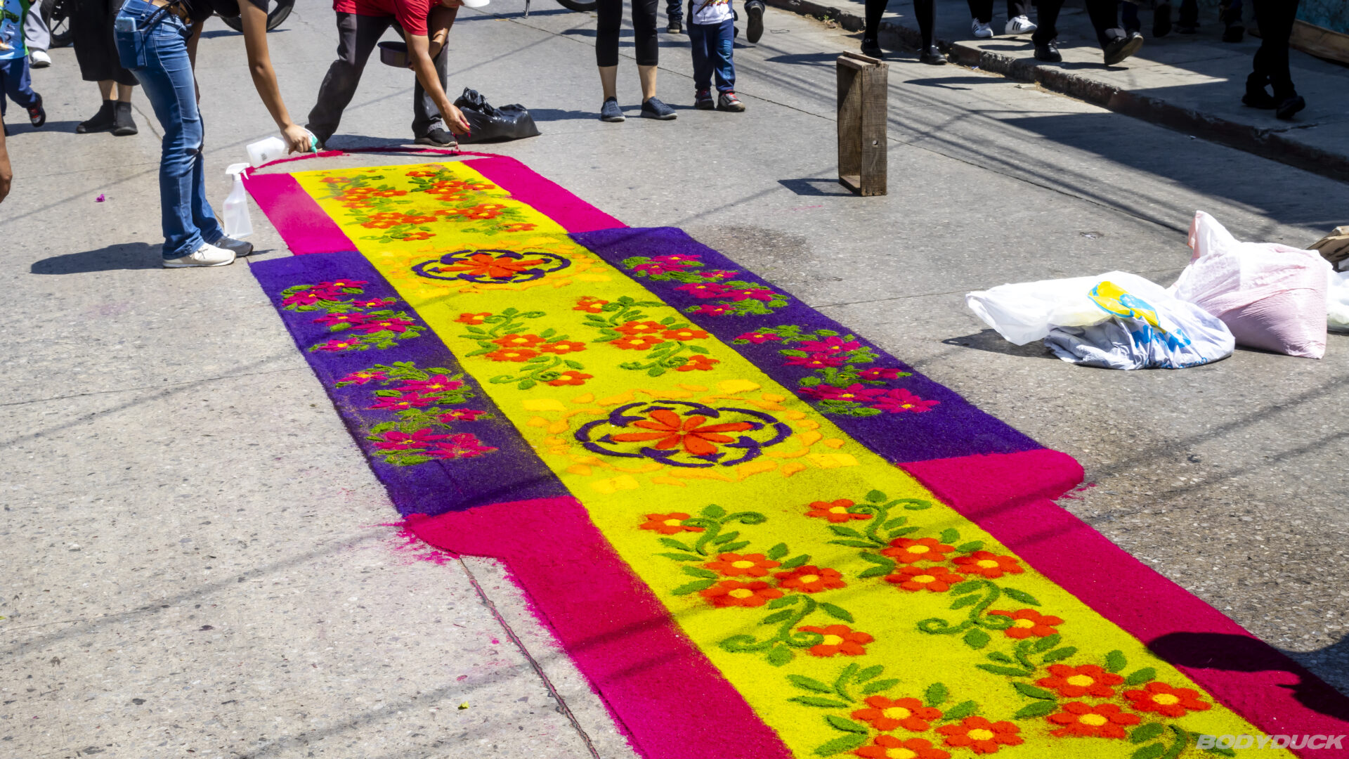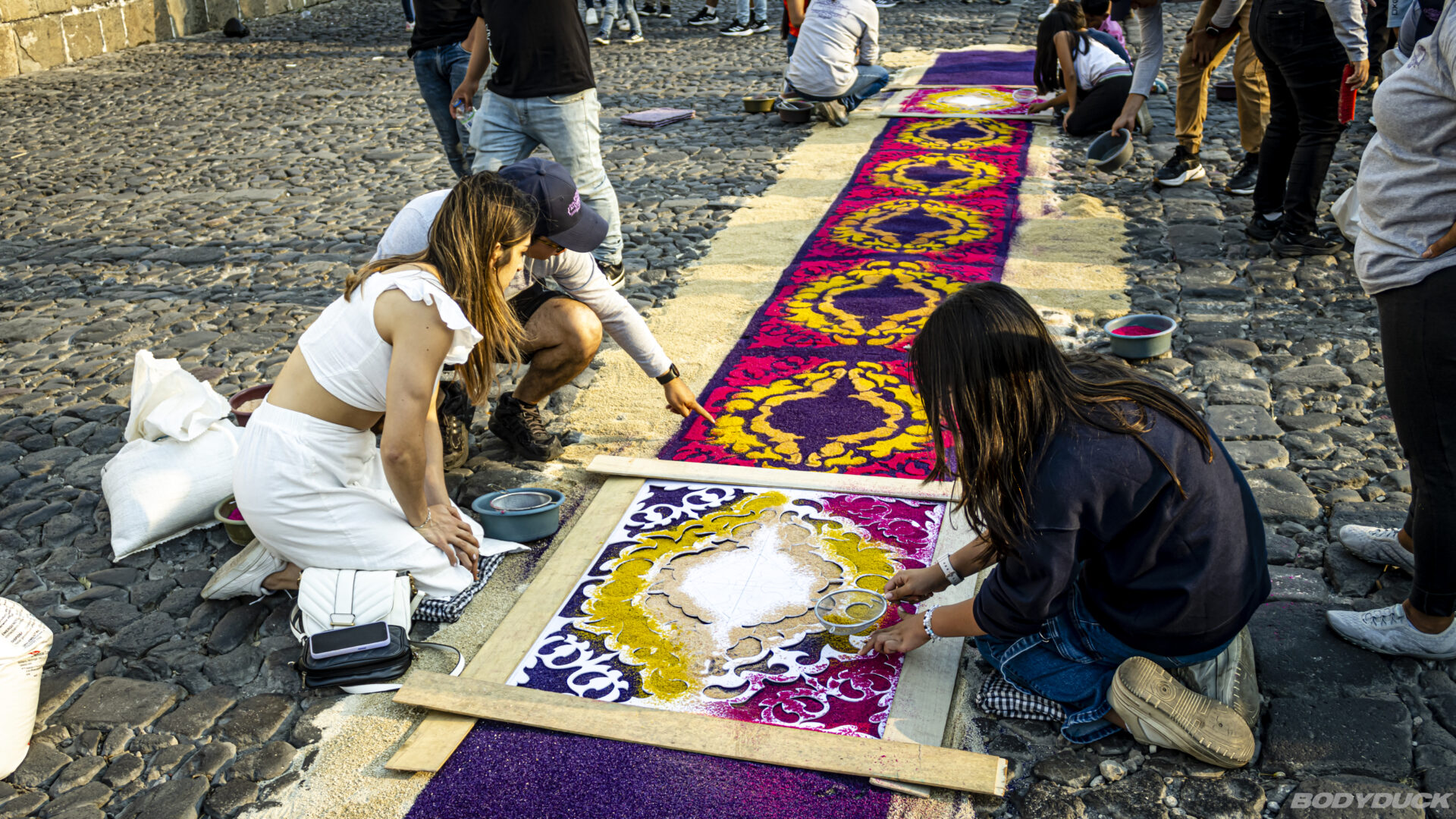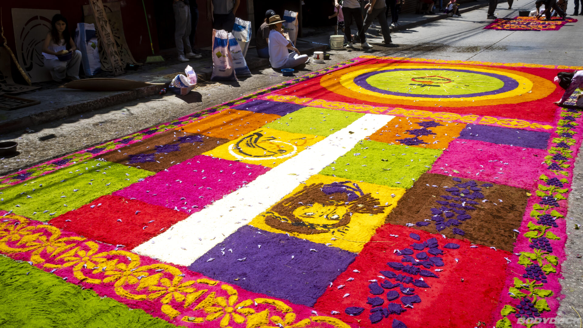 Ein wesentliches Element dieser Tage sind die Alfombras – farbenprächtige Teppiche aus gefärbtem Sägemehl, Kiefernadeln, Früchten und Blumen. Besonders beeindruckend ist die menschliche Komponente: Ganze Familien arbeiten als Freiwillige stundenlang an diesen vergänglichen Meisterwerken. Von den Grosseltern bis zu den Enkeln bringen alle ihre Fertigkeiten ein, um die komplexen Muster direkt auf das raue Pflaster zu legen. Es ist eine kollektive Anstrengung für einen einzigen Moment: Sobald die Prozession darüberzieht, werden die Kunstwerke wieder dem Kreislauf der Strasse übergeben.
