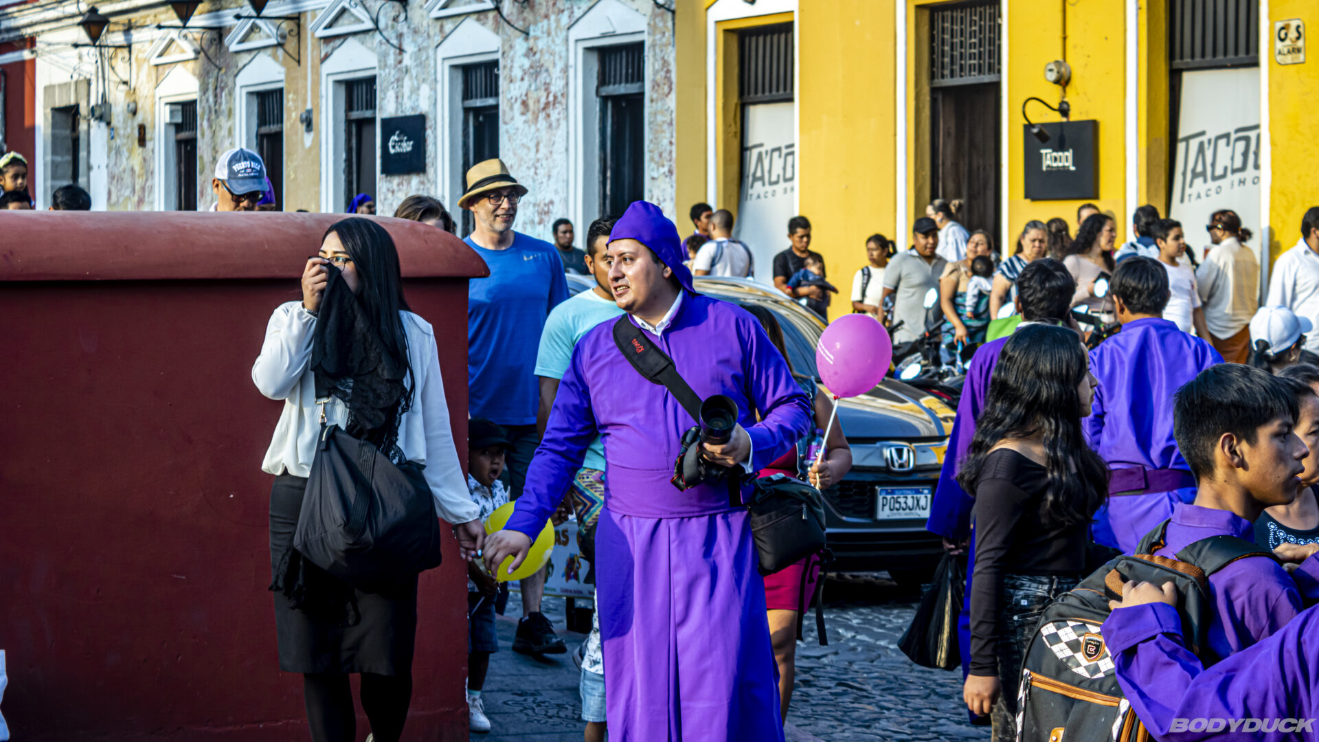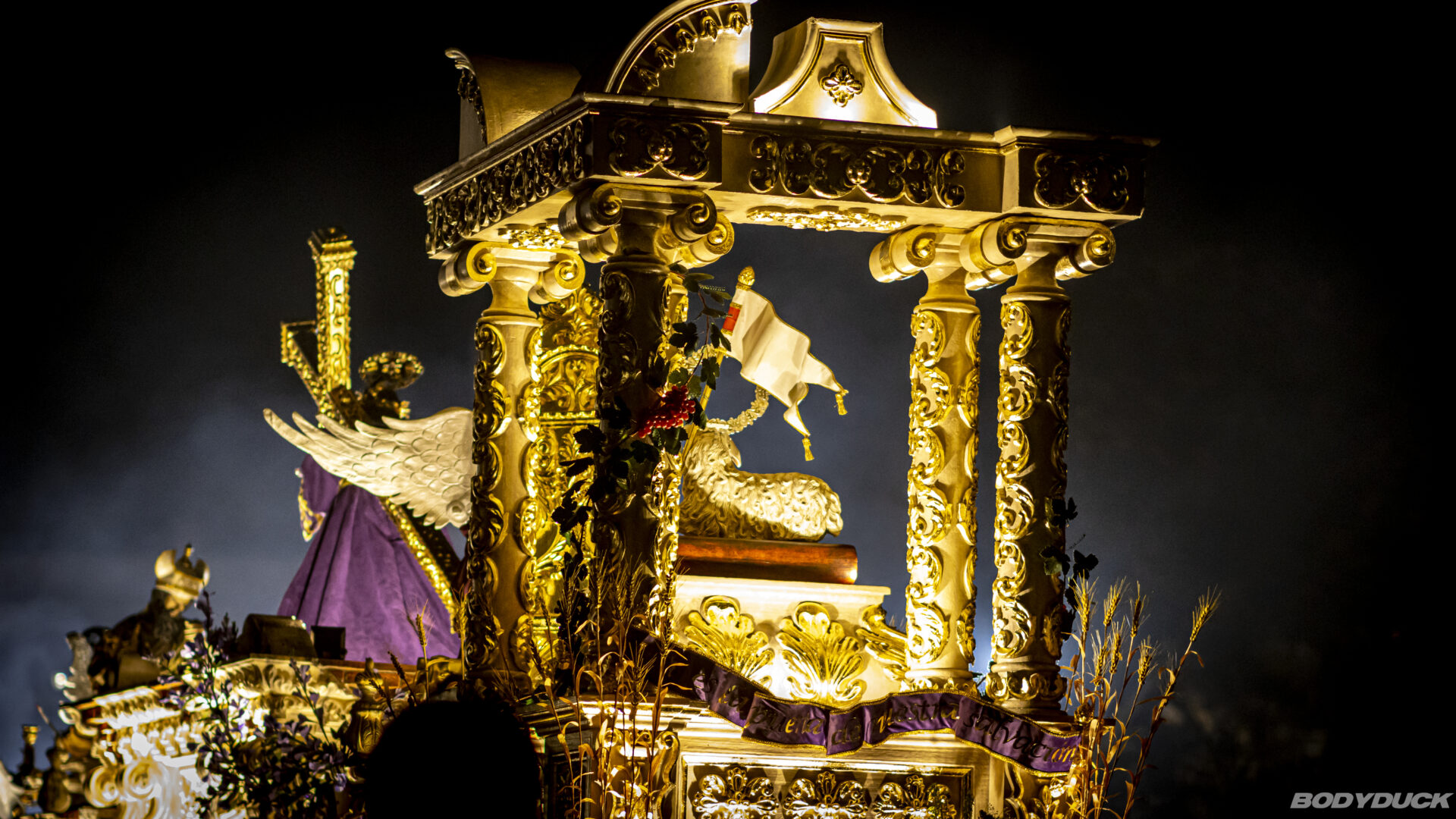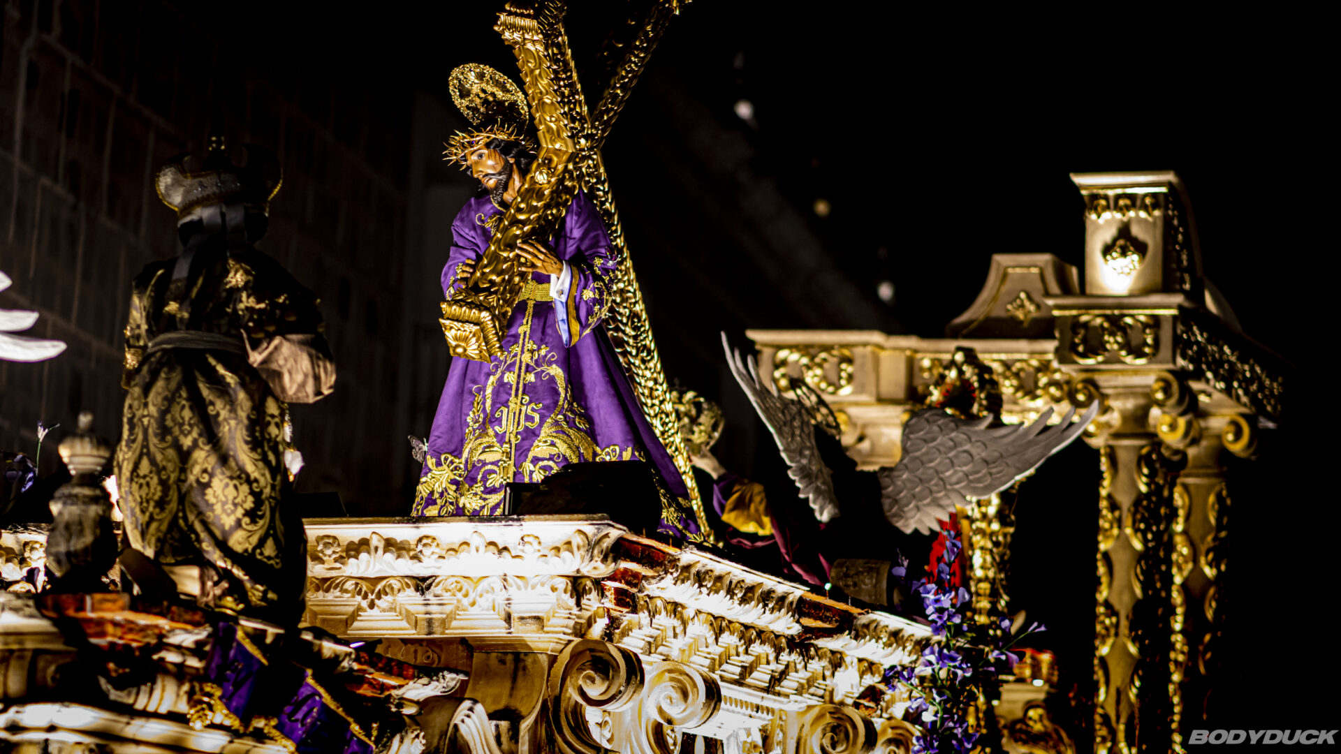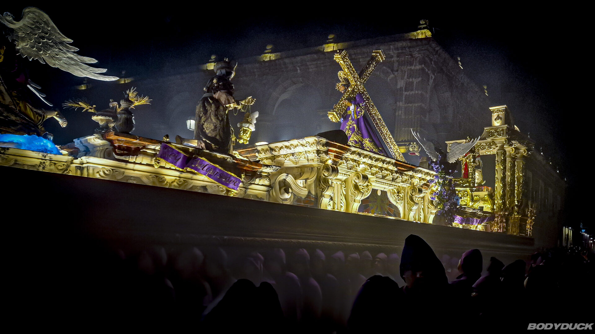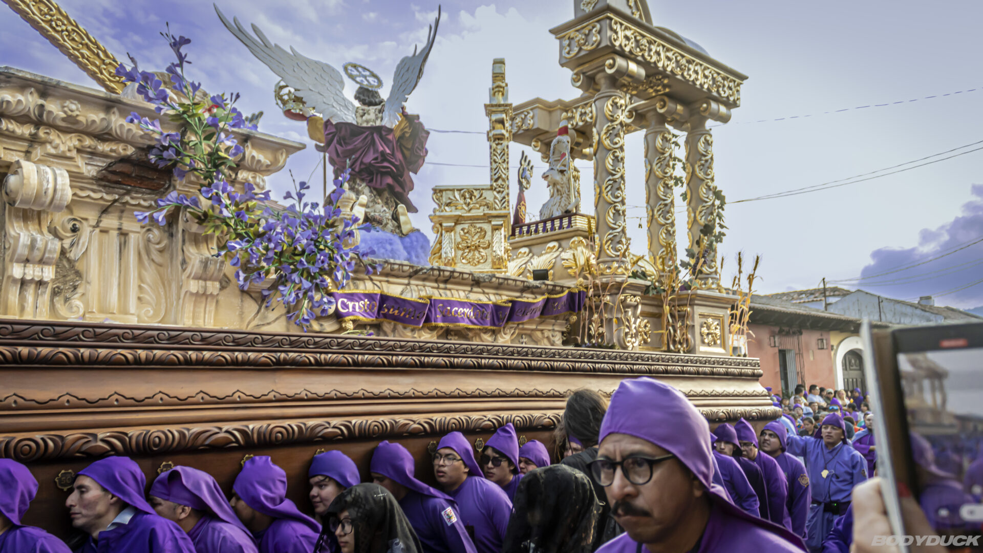 Die Prozession zieht stundenlang durch die Stadt, getragen von hunderten Männern in ihren charakteristischen violetten Gewändern. Wir beobachten, wie die tonnenschwere Anda (das Tragegestell) mit höchster Präzision über die kunstvollen Alfombras manövriert wird. Es ist eine Meisterleistung der Koordination und ein tiefes Zeugnis des lokalen Glaubens. Trotz der Menschenmassen herrscht eine konzentrierte, fast feierliche Ruhe, die nur von den melancholischen Klängen der Prozessionsmärsche unterbrochen wird.
