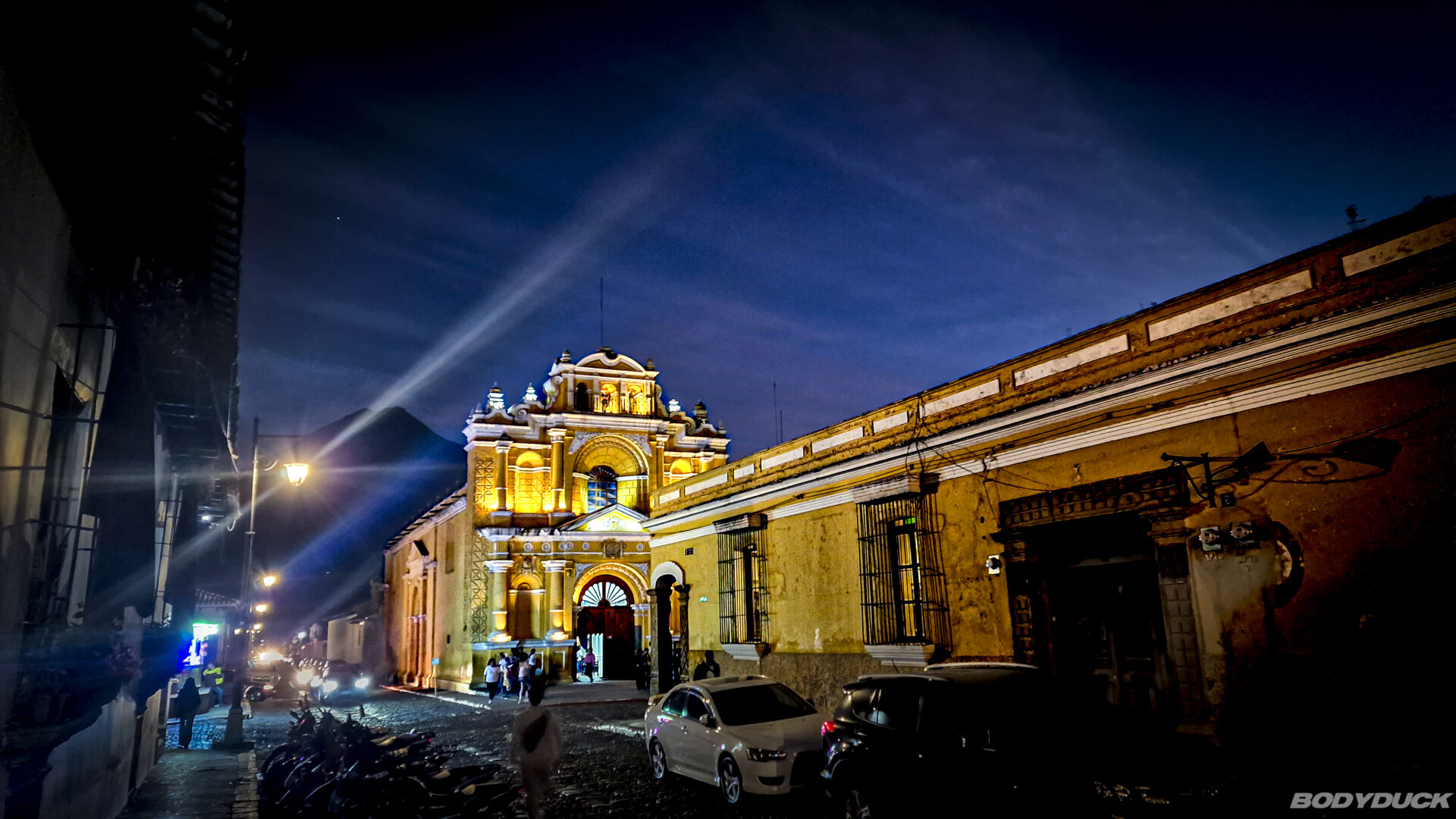 Nach einem wunderschönen Sonnenuntergang ziehen wir gemeinsam mit unseren neuen Reisebekannten und Nachbarn vom Campingplatz los. Die Stadt Antigua entfaltet bei Nacht eine ganz eigene Atmosphäre: Wir bummeln entspannt durch die beleuchteten Gassen und lassen die koloniale Architektur auf uns wirken. Es ist ein stimmiges Zusammenspiel aus Geschichte und lebendiger Gegenwart.