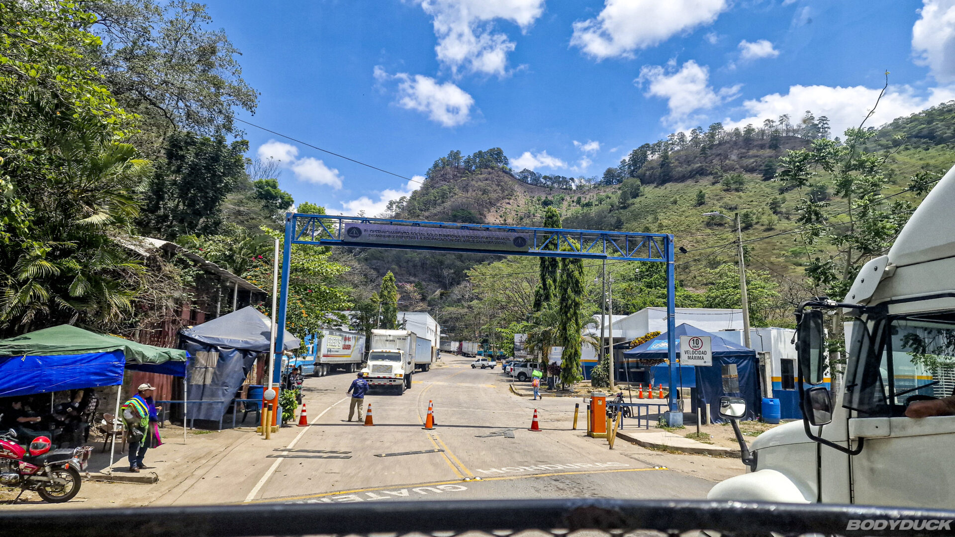 Eine gute Stunde fahren wir an die Grenze zu Honduras. Kurz davor stehen schon die Commercial Trucks in der rechten Spur und warten auf ihre Zollabfertigung. Wir können an ihnen vorbeifahren bis zum ersten Schlagbaum, wo wir angewiesen werden im Zollhof zu parkieren. Vor weg, dieser Grenzübergang ist sehr entspannt und übersichtlich…..