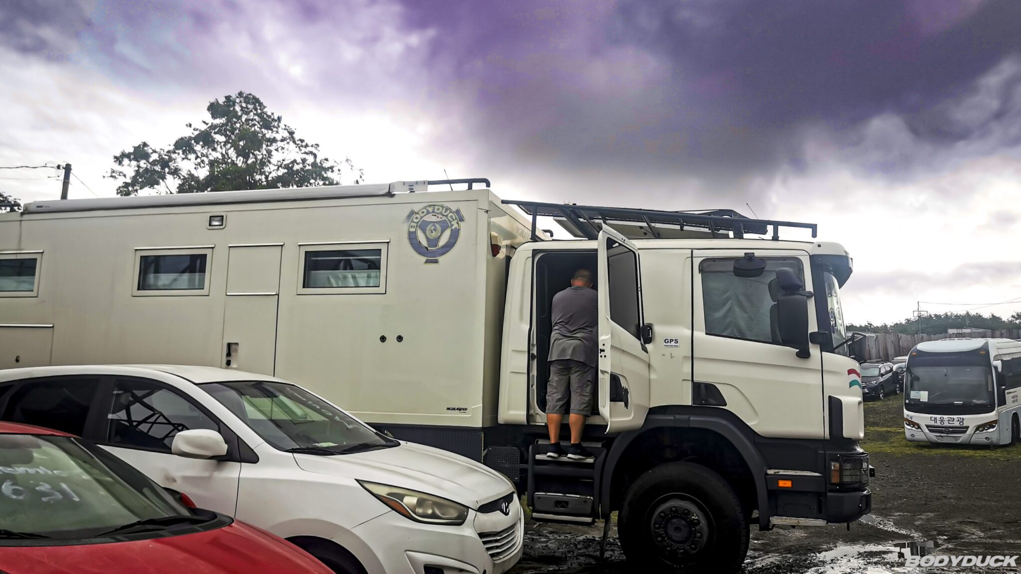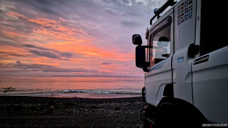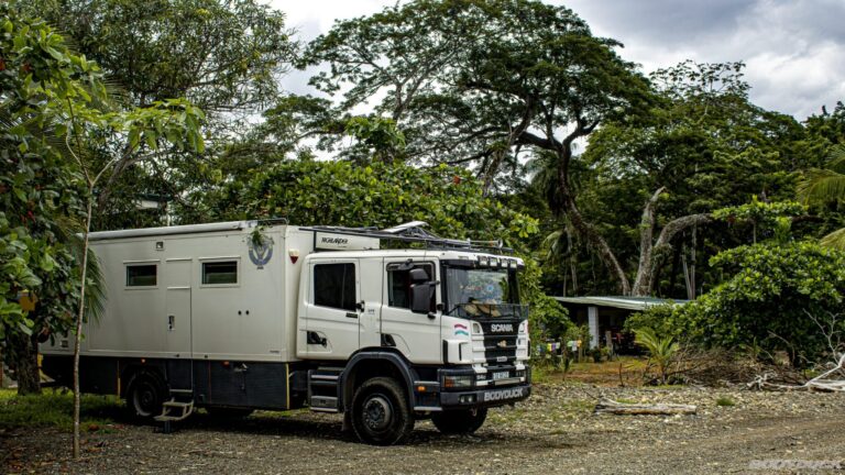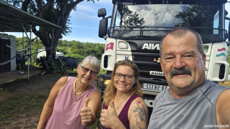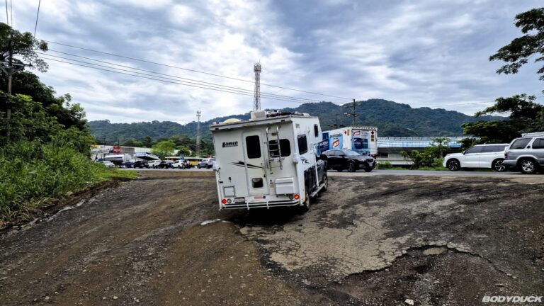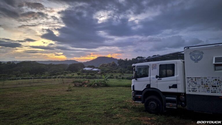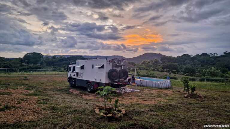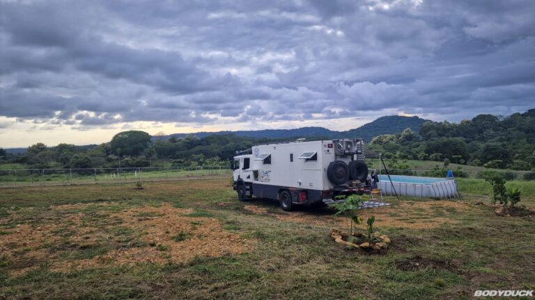 Nach vier Tagen intensiver Vorbereitung fahren wir nach Alajuela zu unserem Langzeitparkplatz bei Terminales Unidas. Wir parkieren den Bodyduck auf dem vorgesehenen Platz und treffen umfassende Vorkehrungen für die sechsmonatige Standzeit. Um Schimmelbildung effektiv vorzubeugen, stellen wir an mehreren strategischen Orten im Wohnbereich sowie in der Fahrerkabine Feuchtigkeitsabsorber auf. Nachdem die Koffer bereits gepackt sind, führen wir eine letzte Kontrolle durch: Alle Fenster werden fest verschlossen, der Strom wird abgestellt und die Batterie konsequent abgeklemmt. Mit einer letzten Streicheleinheit verabschieden wir uns von unserem treuen Gefährten und bestellen ein Uber für den Transfer.