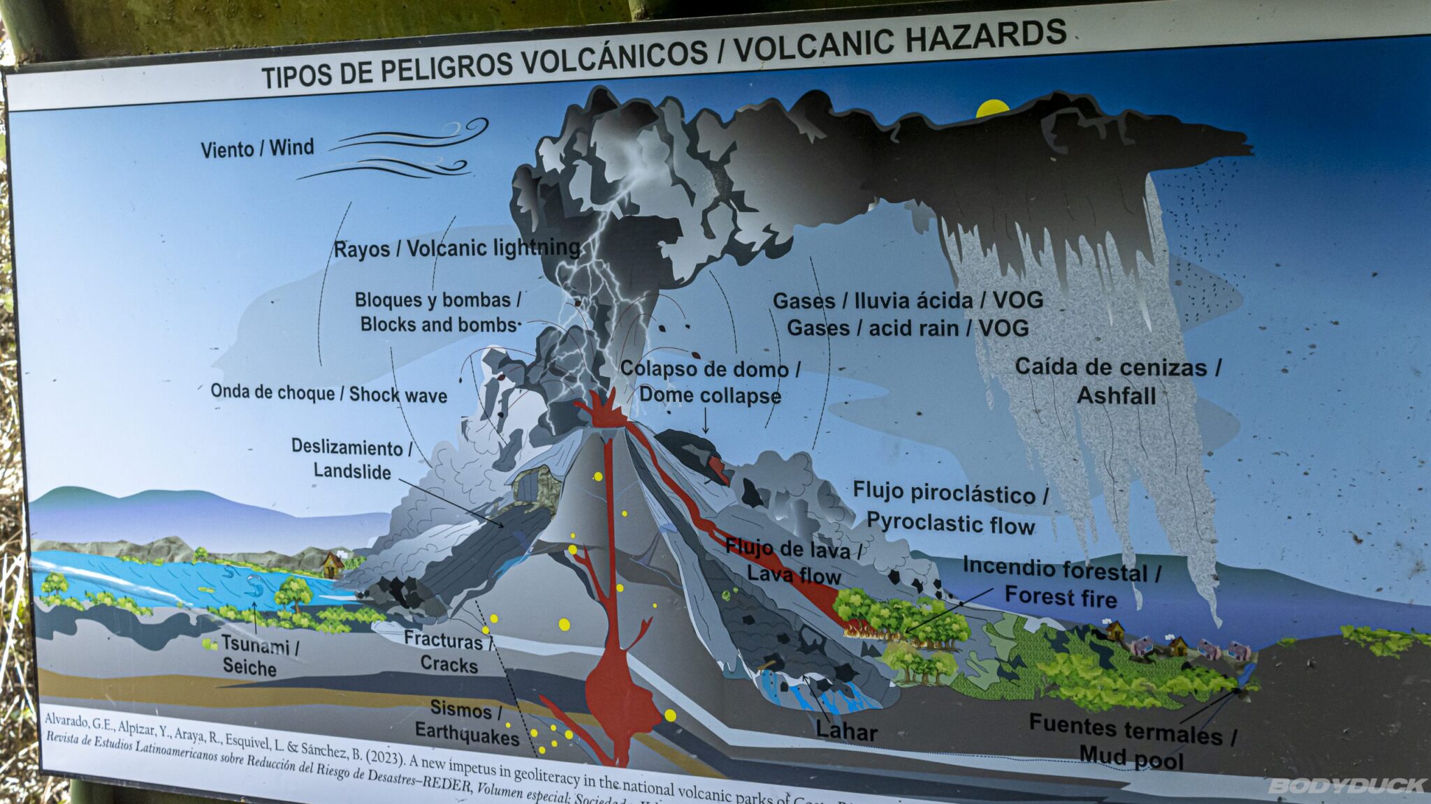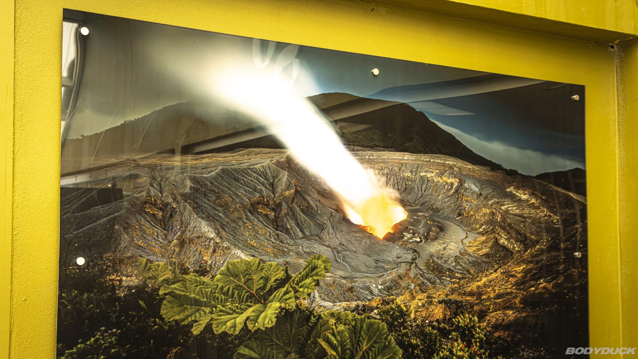 Um die bestmögliche Chance auf eine freie Sicht auf den Krater zu nutzen, setzen wir unsere vorab online erworbenen Tickets für den Besuchs-Slot um 08:00 Uhr morgens ein. Dass wir bereits um 07:45 Uhr vor Ort sind, widerlegt die Erwartung langer Autoschlangen vor dem Eingang. Pünktlich um 08:00 Uhr öffnen die Mitarbeiter das Tor, woraufhin wir am Ticketschalter den QR-Code scannen lassen und eine Parkgebühr von 5 USD entrichten. Vom Parkplatz aus führt ein längerer Fussweg zur oberen Ebene. Im Besucherzentrum betrachten wir die Bilder des Vulkans aus verschiedenen Zeitperioden, die mit ausführlichen Beschreibungen auf Spanisch und Englisch versehen sind.